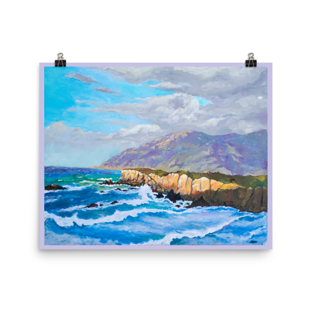 Indulge in the captivating beauty of Big Sur with this mesmerizing artwork print. Majestic cliffs, rhythmic waves, and a serene interplay of clouds and mountains transport you to the heart of this enchanting coast.