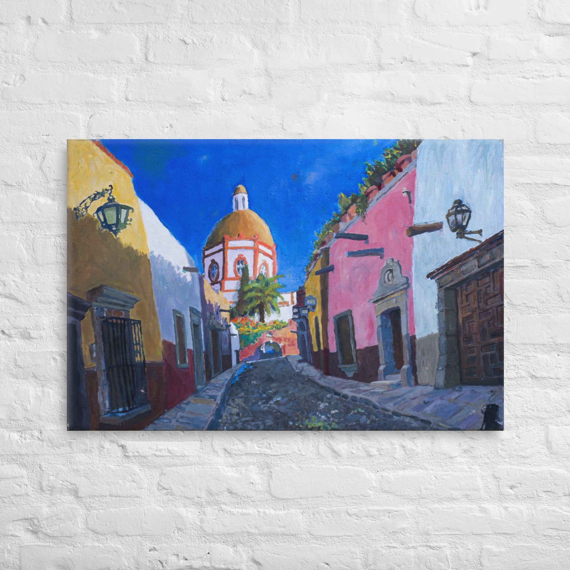 Based on an iPhone picture taken at 6 AM while walking a dog. I left out the cathedral and the dog because everybody paints those. Embark on an early morning stroll through San Miguel de Allende with our canvas print. An eye-catching cacophony of colorful buildings line the path of a calm and quiet alleyway.
