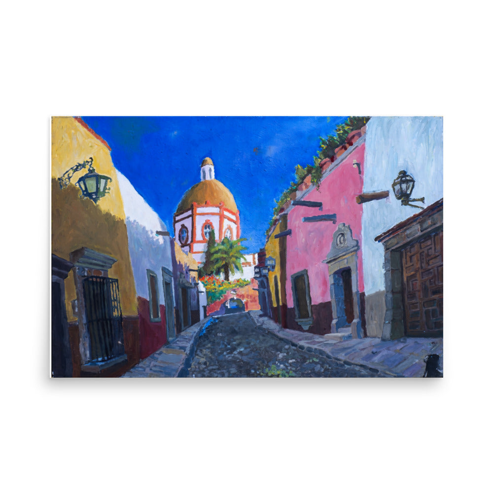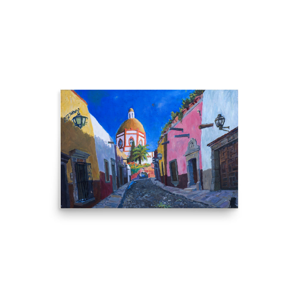 Based on an iPhone picture taken in Mexico while walking a dog. I left out the dog and the cathedral because everybody paints those. Embark on an early morning stroll through San Miguel de Allende with our art print. This piece depicts a peaceful alleyway adorned with colorful buildings lining the path.